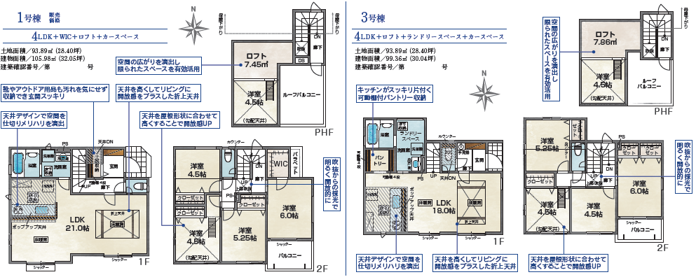 - ➀号棟4LDK+WIC+ロフト+カースペース ③4LDK+ロフト+ランドリースペース+カースペース